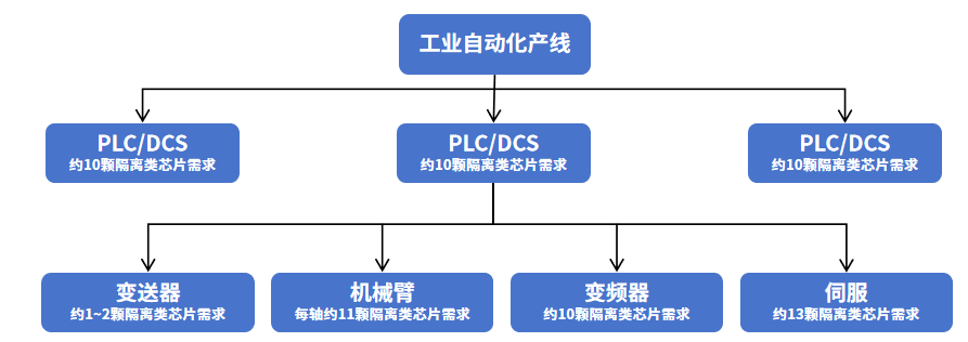 此外,每个PLC/DCS节点都控制着一个至多个变送器、机械臂、变频器、伺服等设备,而出于UL1577和IEC 61010等安规需要,任何涉及人机交互或高低压混合的场景,都必须通过电气隔离构建安全屏障,因此这些设备同样需要使用数字隔离器进行电气隔离,数字隔离器已然成为了工业控制系统中不可或缺的刚需品。
