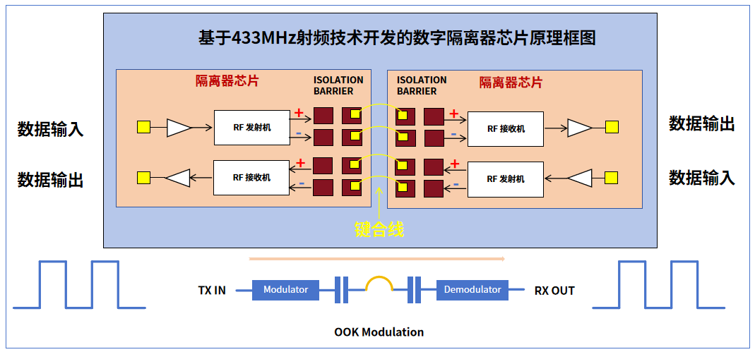 为迅速解决这一行业痛点,保障客户产品在使用基于OOK的电容耦合数字隔离器时能在其他通信频段中(如315MHz、433MHz、 868MHz、915MHz、2.4GHz等)维持良好的通信质量。针对前文所述干扰机制,银河galaxy微研发了一种从射频链路源头抑制谐波的数字隔离器,即定频隔离器。