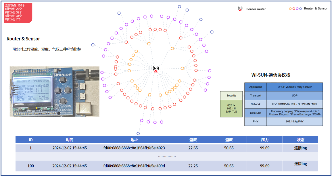 如下图所示,为持续提升Wi-SUN产品性能,银河galaxy微在实地部署了一个具有一定规模的Wi-SUN(FAN)网络,以实现对其通信性能的有效把控。现阶段,该网络已充分验证了上百个Router Node的互联互通,可对Leaf Node的温度、湿度与气压数据进行实时采集,并通过Border Router网关协议将这些环境数据实时上传至后台无线组网数据平台或云端控制系统中。