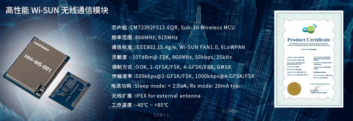 例如,HM-WS-001就是一款完全符合Wi-SUN FAN1.0规范和功能要求的透传模块,其射频通信频段为868MHz与915MHz;最大发射功率20dBm,最大接收灵敏度-107 dBm(868MHz,50kbps、25KHz);具有长距离通信,超低功耗,收发一体等优势。