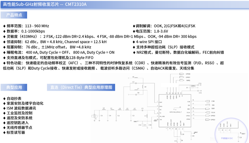 例如,在低功耗的无线传感器网络中,合理配置CMT2310A的相关寄存器即可使得传感器节点的Tx和Rx工作于Duty Cycle运转模式,可在确保数据可靠传输的同时,大幅降低传感器节点的运行功耗,延长节点待机时间。