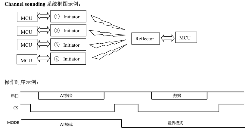 如上图所示,HM-BT2401DA支持RTT(往返时间)和PBR(基于相位测距)模式,在信道探测过程中,启动器(Initiator)会在指定的72个2.4 GHz物理信道中发送载波信号或数据包,反射器(Reflector)则通过将载波信号或数据包发回给启动器(Initiator)来进行响应;启动器(Initiator)在得出数据包的往返时间以及不同频率载波信号之间的相位差数据后,即可运行特定的距离测量算法得出两者间的准确距离,并通过串口将计算结果上报MCU。