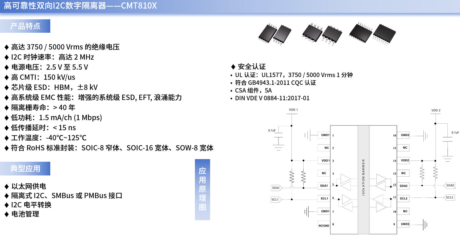 IIC接口通常被应用在短距离、低速率、多设备互联的场景中(如单片机与低速外设交互、多设备共享总线通信、传感器数据采集等),通过采用CMT810X系列产品,设计师们不仅能确保切断IIC通信链路中的直接电气连接,还能隔离地环路与共模干扰、保障双向信号传输的完整性、保护低压敏感元件(如MCU或外设IO口)、支持宽电压电平转换、提升系统安全性。
