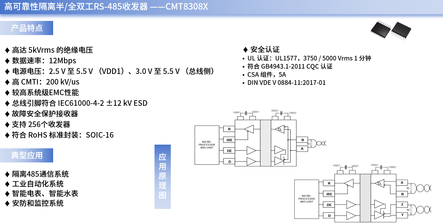 RS-485接口通常被应用在长距离、多节点互联的通信场景中(如单片机与远程设备交互、多节点工业设备通信、长距离数据采集与监控等),通过采用CMT8308X系列产品,设计师们不仅能确保切断RS-485通信链路中的直接电气连接,还能隔离地环路与共模干扰、保障高速信号传输的完整性、提供系统级ESD保护与故障安全功能、支持多节点稳定互联、提升通信稳定性与安全性。