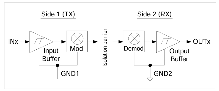 以市场主流的电容耦合数字隔离器为例,在其芯片内部,输入信号被转换为高频的脉冲信号,这些脉冲信号通过电容的电场耦合作用,跨越隔离屏障传输到输出端。在输出端,再将接收到的脉冲信号还原为原始的数字信号,从而实现了信号在不同电位的电路之间的安全传输,同时为两侧电路提供稳定的电气隔离环境,可避免各种潜在的电气问题。