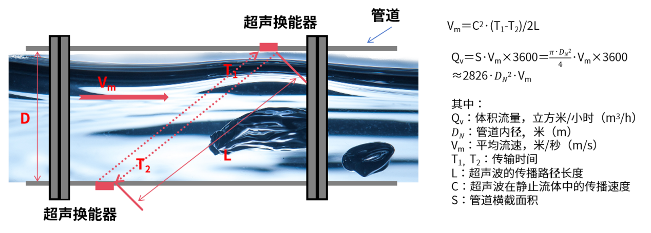 时差法超声波流量计测量流体流量Qv的基本原理是:流量Qv等于流速Vm与管道横截面积S的乘积,再乘以时间换算系数(将秒换算为小时,3600s=1h),其计算公式为: